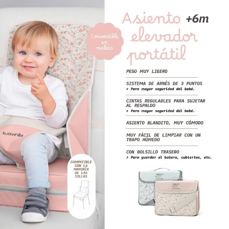 Este alzador portátil es compatible con la mayoría de sillas, lo que lo convierte en el aliado perfecto para las comidas fuera de casa. Su diseño práctico y ligero facilita el transporte y garantiza la comodidad de tu bebé en cualquier situación.