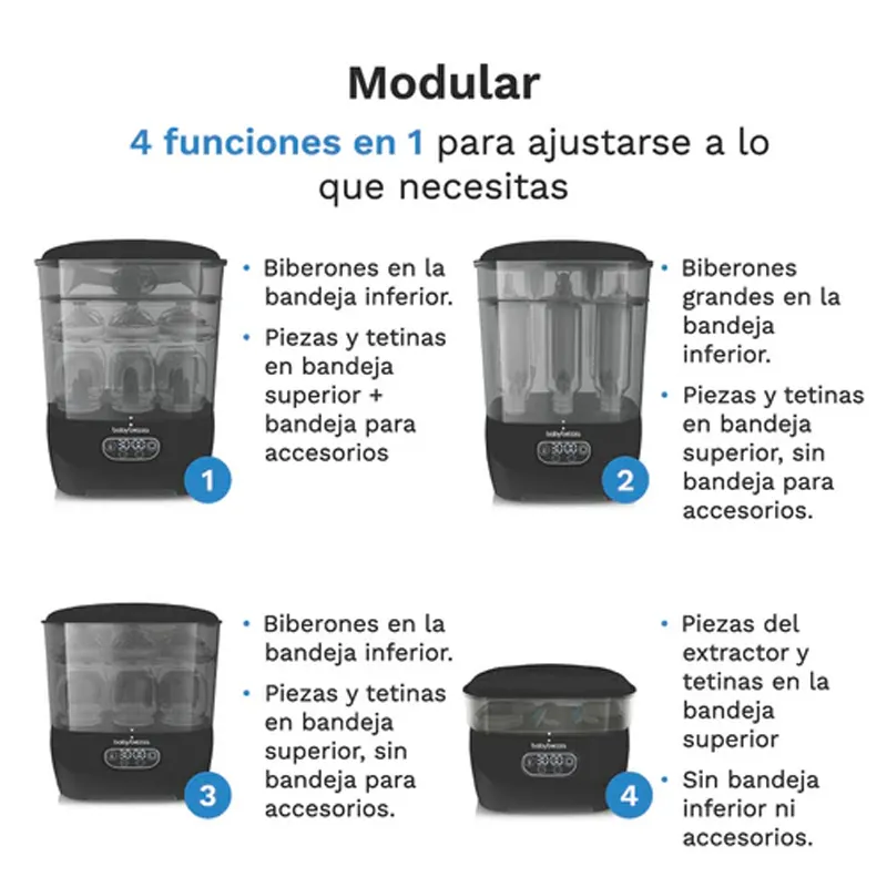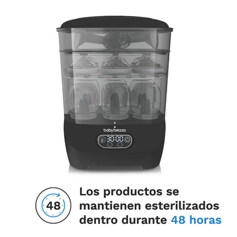 Este esterilizador y secador automático es la solución ideal para mantener los accesorios del bebé perfectamente higienizados de forma rápida y segura. Diseñado para ahorrar tiempo y ofrecer máxima eficacia, combina esterilización con vapor y secado con aire filtrado en un solo dispositivo.