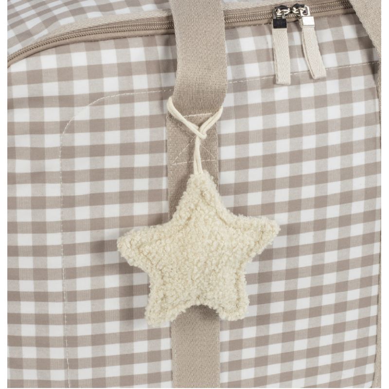 En el compartimiento interior, encontrarás un forro a juego con gomas para contener la ropa y mantener todo en su lugar. También incluye un charm en forma de estrella, donde puedes bordar el nombre de tu bebé para personalizar el bolso y darle un toque único.