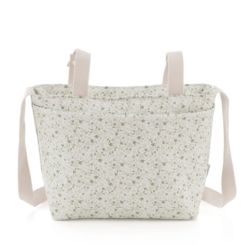 Un bolso organizador con asas cortas para colgar del carrito, con diseño de bolsillos internos y externos, ofrece fácil acceso y orden para los accesorios del bebé durante los paseos. Práctico y accesible.