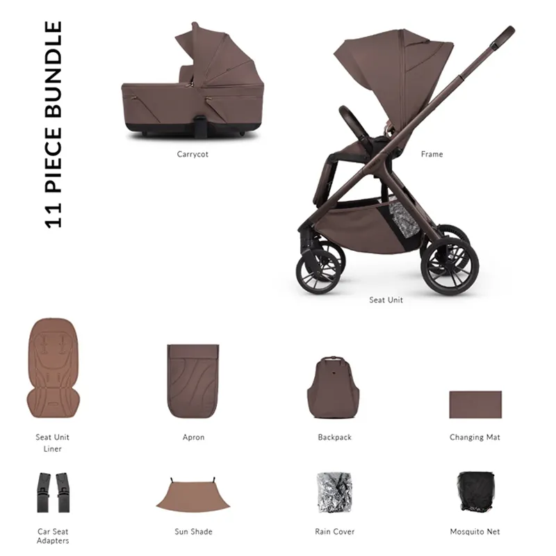 Accesorios incluidos: El conjunto incorpora chasis, capazo, unidad de asiento, acolchado para la silla, mochila, cambiador, burbuja de lluvia, protector solar, mosquitera y adaptadores para silla de coche.