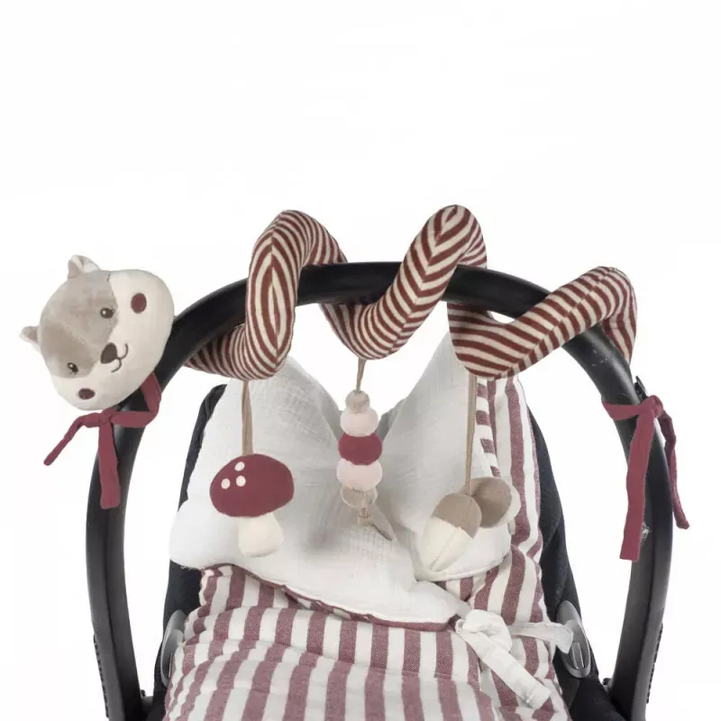 El juguete espiral con ardilla de la colección Cherry Rayas de Pasito a Pasito es el compañero ideal para estimular los sentidos del bebé mientras se divierte en sus paseos o viajes.