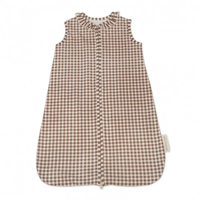 El saco de dormir de verano Praliné Vichy/Rayas de Walking Mum está pensado para bebés de 1 a 4 meses, ofreciendo un descanso ligero, seguro y transpirable durante los meses cálidos o en habitaciones con temperatura elevada.