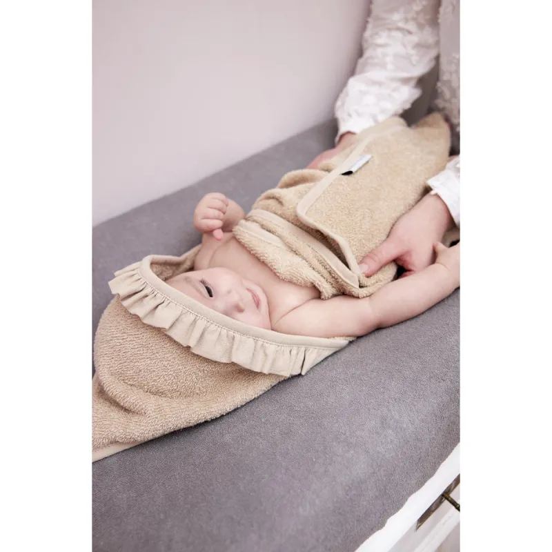 Tejido de rizo 100% algodón maravillosamente suave. Muy alta calidad. Absorbe bien la humedad. Capucha con bonitos volantes. No utilice demasiado detergente (esto también es mejor para el medio ambiente). Se puede lavar a máquina a 40 grados como máximo. Se puede planchar a temperatura media-alta. Apta para la secadora, pero también se mantiene suave al secarla en el tendedero.