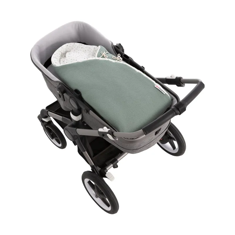 El saco para capazo bebé, incluye cremallera reversible en su parte inferior, abrochándose mediante lacitos de algodón. Además, dispone de ojales para adaptarlo al paso del arnés de la mayoría de capazos o sillas de paseo del mercado.