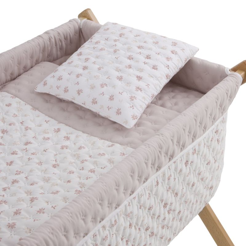 La minicuna con estructura en forma de aspa de Cambrass está fabricada en madera de haya. Permite el descanso del bebé en cualquier estancia de la casa durante los primeros meses de vida gracias a la movilidad que le aportan las ruedas (con freno).Otros aspectos que hacen especialmente funcional esta minicuna, incluye almohada, colchón y somier de madera de 5mm, soporte de madera y su vestidura cosida que incluye la colcha con relleno. Por recomendación de la normativa Europea (EN 1130 UNE-EN 11890:2018) y del real decreto 1801/2003 sobre la seguridad general de los productos, la minicuna no puede ser plegable. Según normativa, debe dejarse de usar la minicuna tan pronto como el niño pueda sentarse por sí solo, levantarse o empujarse con sus manos y rodillas.