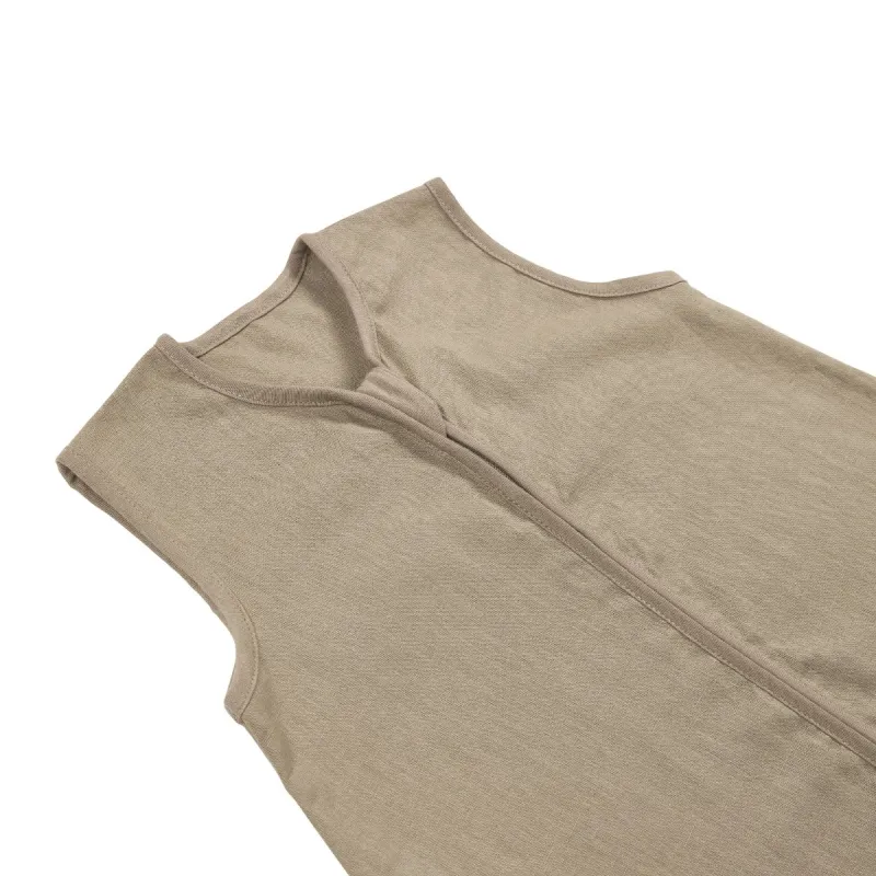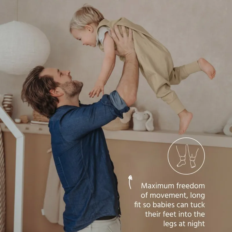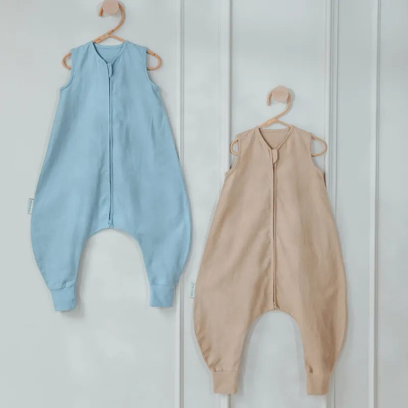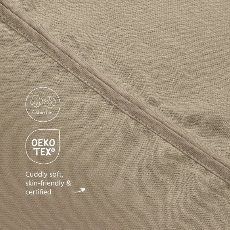 El saco de dormir no está forrado y está confeccionado con un tejido fino de una sola capa compuesto por 52% lino y 48% algodón. El lino es conocido por sus excelentes propiedades refrescantes y resulta ideal para las cálidas noches de verano, mientras que el algodón aporta suavidad y comodidad al contacto con la piel. El material transpirable garantiza una excelente ventilación y un entorno de descanso fresco, ayudando a que tu pequeño se mantenga cómodo sin sobrecalentarse. Gracias a su ajuste seguro alrededor del cuello y las sisas, tu hijo puede moverse libremente mientras duerme de forma segura.