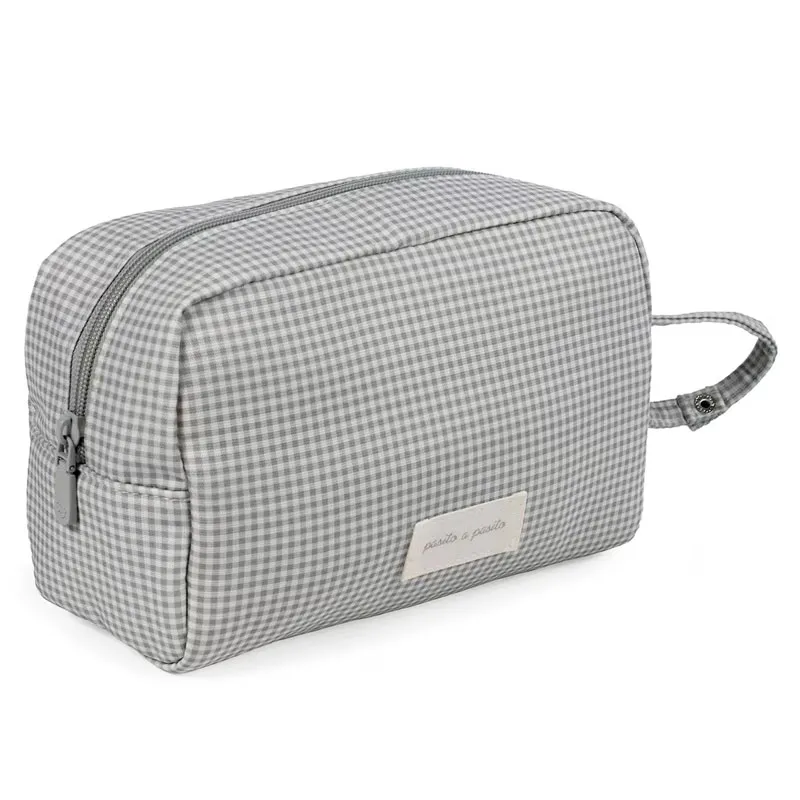 El neceser de bebé Little Bloom Vichy gris de Pasito a Pasito es un complemento práctico, elegante y muy útil para llevar organizados los productos de aseo del bebé durante las salidas. Su formato compacto, su diseño cuidado y sus materiales de calidad lo convierten en una opción ideal para tener siempre a mano lo imprescindible de la higiene diaria.
