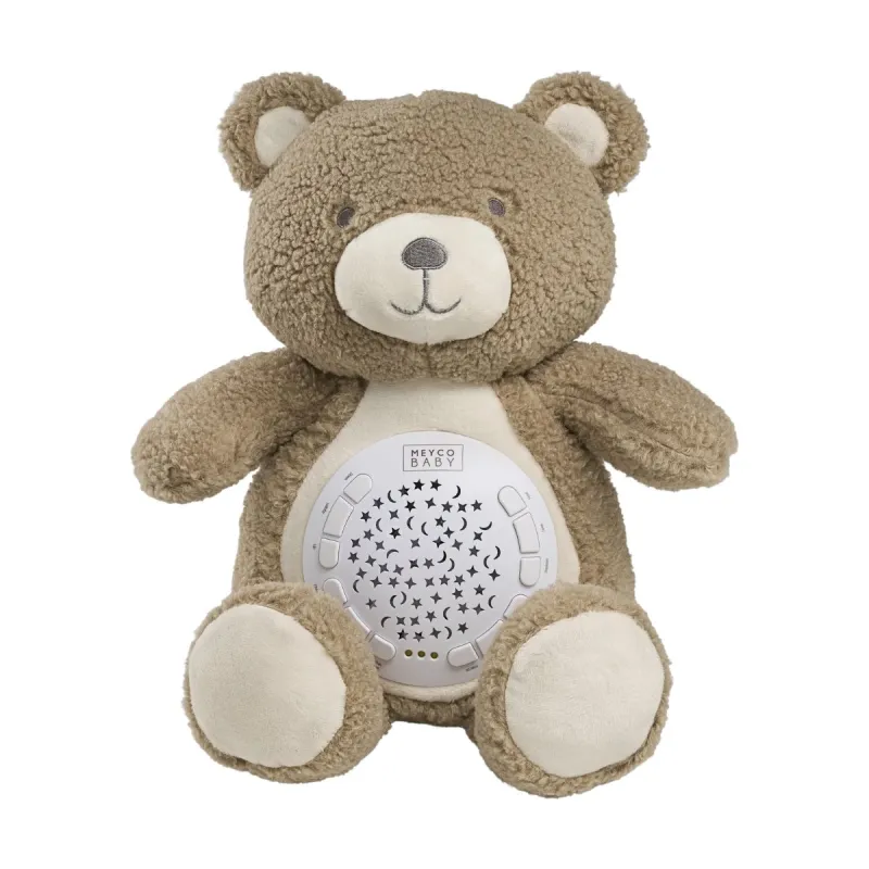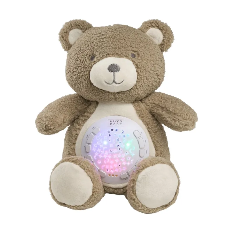 El osito está fabricado en 100% poliéster y funciona con 3 pilas AAA (no incluidas). El proyector se puede retirar fácilmente, lo que permite limpiar el peluche de forma segura y delicada cuando sea necesario.