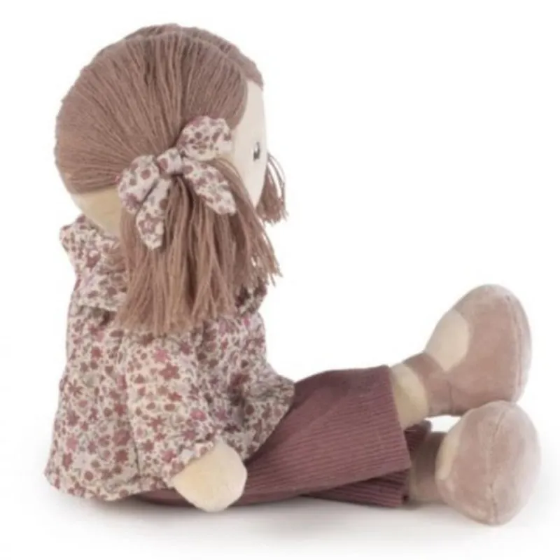 Diseño encantador: Bibi mide 35 cm y luce un conjunto floral en tonos rosados y rojos, acompañado de un pantalón de pana y coletas con lazos, aportando un aire dulce y alegre.