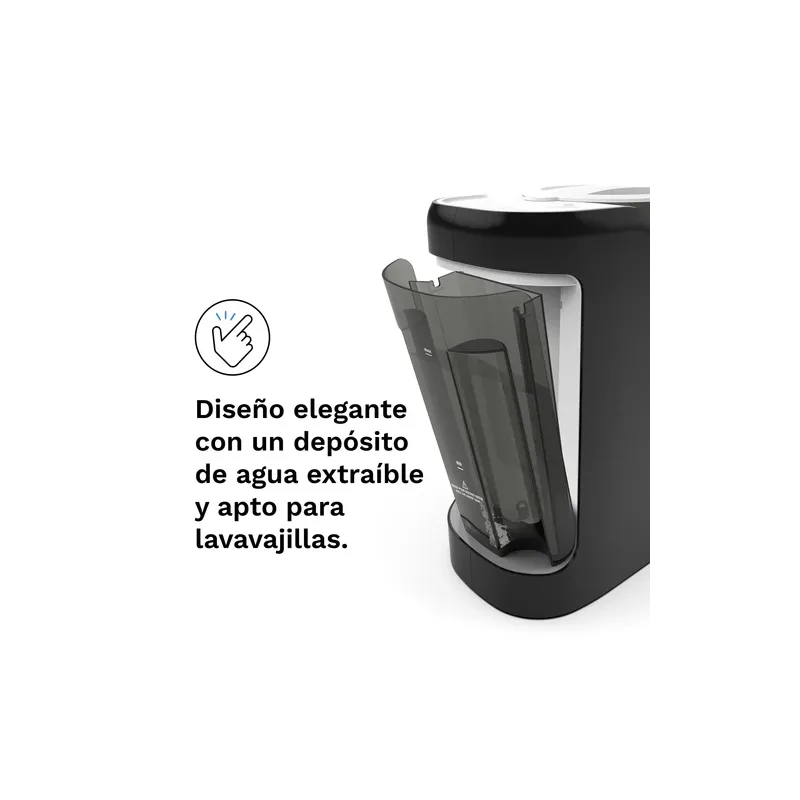 Depósito de agua extraíble y apto para lavavajillas; componentes desmontables para limpieza regular.