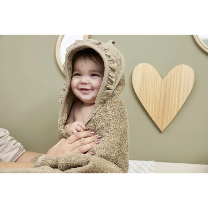A capa de banho é feita de algodão turco 100% muito suave. Esta capa de banho é essencial para qualquer pequenino. Após o banho, o duche ou a natação, envolva o seu filho nesta capa e coloque o capuz sobre a cabeça. Isso cria uma sensação aconchegante que o seu pequenino vai adorar. O que torna esta capa de banho realmente irresistível são os bonitos folhos do capuz. Eles dão à capa de banho um toque extra de estilo e alegria. O seu bebé não só ficará lindíssimo, como também se sentirá confortável e quentinho. A toalha de banho não é apenas funcional e elegante, mas também de alta qualidade. O suave algodão turco garante que o seu pequenino se seque rapidamente e se mantenha quentinho após o banho. Além disso, a capa de banho é fácil de lavar e dura muitas lavagens.