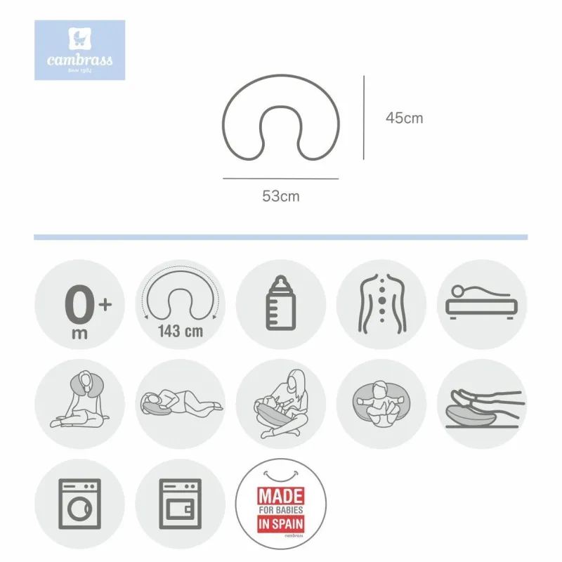 O cojín de lactância pequeno da Cambrass é muito prático durante o período de lactância, tanto se a lactância é materna como se é de biberão. Durante a lactância serve tanto para o bebé como para a mãe (ou o adulto). Neste caso, favorece que o bebé adquira uma posição mais confortável ao descansar os ombros e a cabeça sobre o cojín, evitando assim que qualquer movimento do adulto possa afetá-lo. Ao mesmo tempo, proporciona ao adulto um apoio extra para os braços, evitando tensões no cotovelo, costas e pulso. Além do seu uso para a lactância, também está indicado para o adulto que, ao colocá-lo ao redor do pescoço, relaxa os músculos e as cervicais, obtendo uma sensação muito confortável.