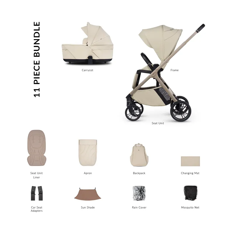 Acessórios incluídos: O conjunto incorpora chassi, berço, unidade de assento, acolchoado para a cadeira, mochila, trocador, bolha de chuva, protetor solar, rede mosquiteira e adaptadores para cadeira de carro.