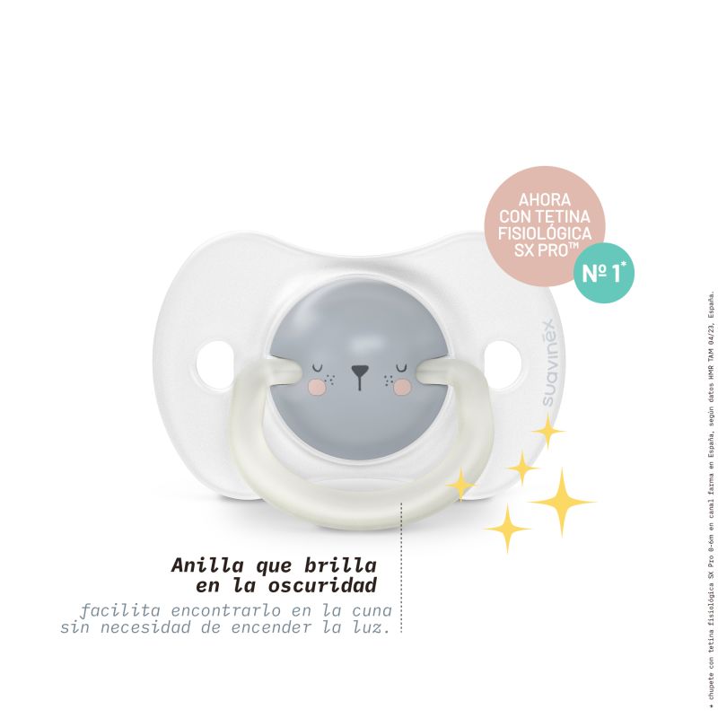 - Com o seu mamilo fisiológico de silicone SX Pro, projetado para cuidar do desenvolvimento bucal do bebé, é quase como se não tivesse um chupete. Ideal desde o nascimento e recomendado pela Sociedade Espanhola de Odontologia Pediátrica.
