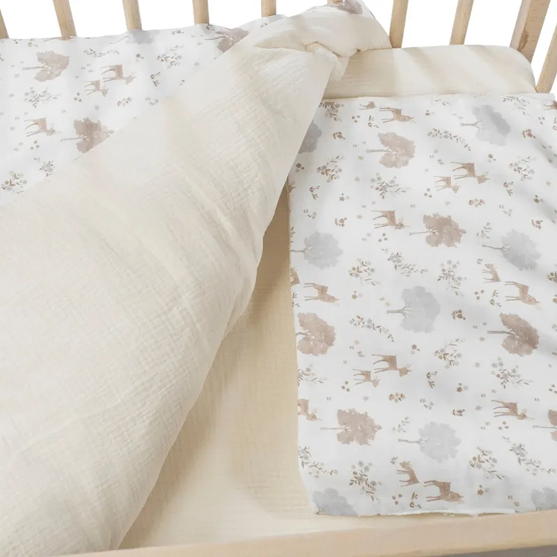 O design apresenta motivos de cervos e árvores em tons suaves, trazendo um estilo quente e atemporal ao quarto do bebê.