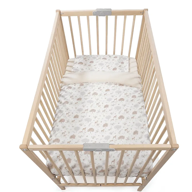 Inclui edredão, capa de almofada, lençol de baixo de musselina e almofada respirável, adaptado a berços de 120 x 60 cm.