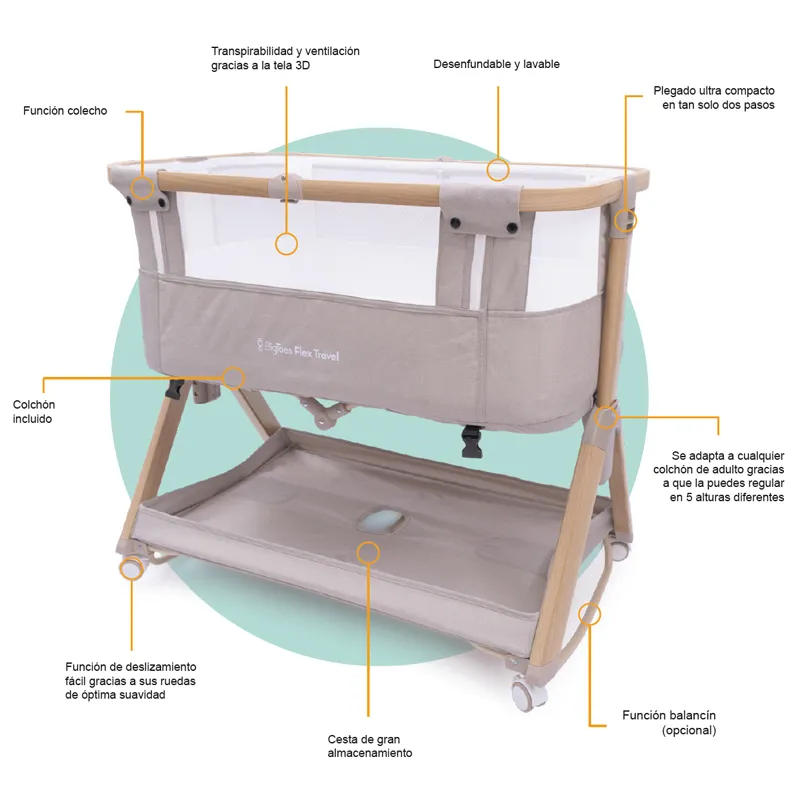 A minicuna BigToes Flex Travel é um berço de viagem ultracompacto pensado para famílias que precisam de uma solução confortável, segura e fácil de transportar para o descanso do bebê em casa, em viagem ou como co-sleeping ao lado da cama dos pais.