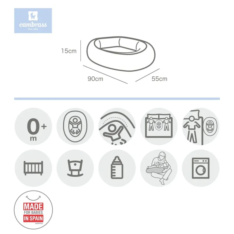 O berço ninho de Cambrass, é projetado para o bem-estar do bebê, é um artigo multifuncional, a função principal, é envolver o bebê e poder gastá-lo nos primeiros dias de vida do bebê, tanto na cama dos pais, como no berço, minicuna, minicunacolecho, serve para viagens, pois seu design é perfeito para poder gastá-lo em qualquer situação. Muitos pais o usam para quando o bebê vai para o berço e, assim, está mais recolhido e protegido. Também pode ser desmontado e a parte lateral (cozinha) serve como almofada de amamentação e a parte inferior como um trocador para a casa. A almofada é preenchida com fibras ocas para a máxima adaptação e a base, leva um tapete plastificado para poder gastá-lo mais tarde como trocador. Todos os tecidos podem ser lavados em máquina de lavar e secar. FABRICADO EM ESPANHA.