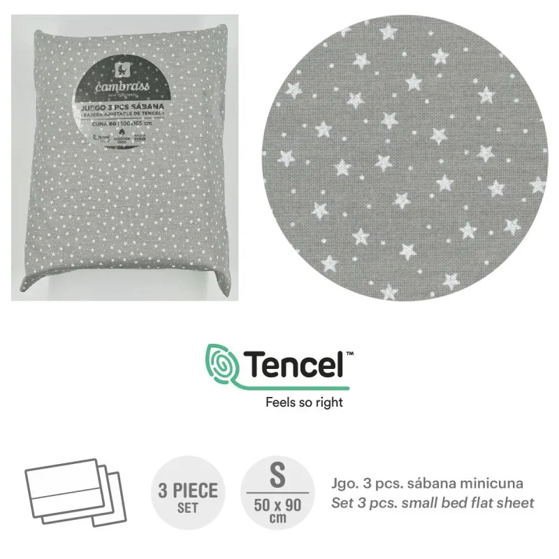 O lençol confeccionado com fibras TENCEL™, impermeável e respirável (para berço 60) da Cambrass, funciona como um prático lençol justo. Feito na Espanha. Por Cambrass.