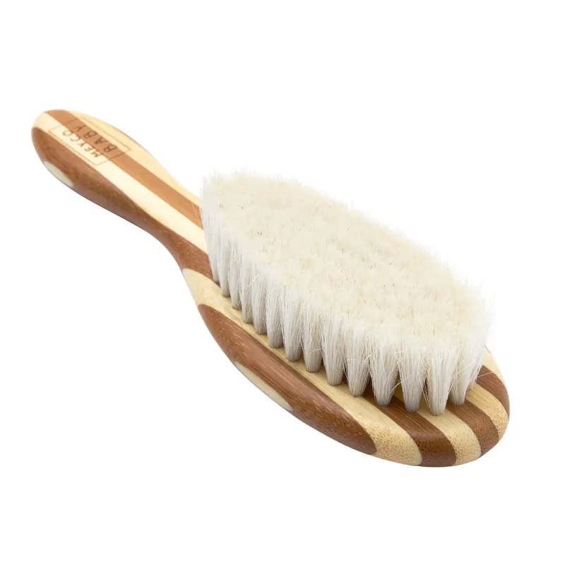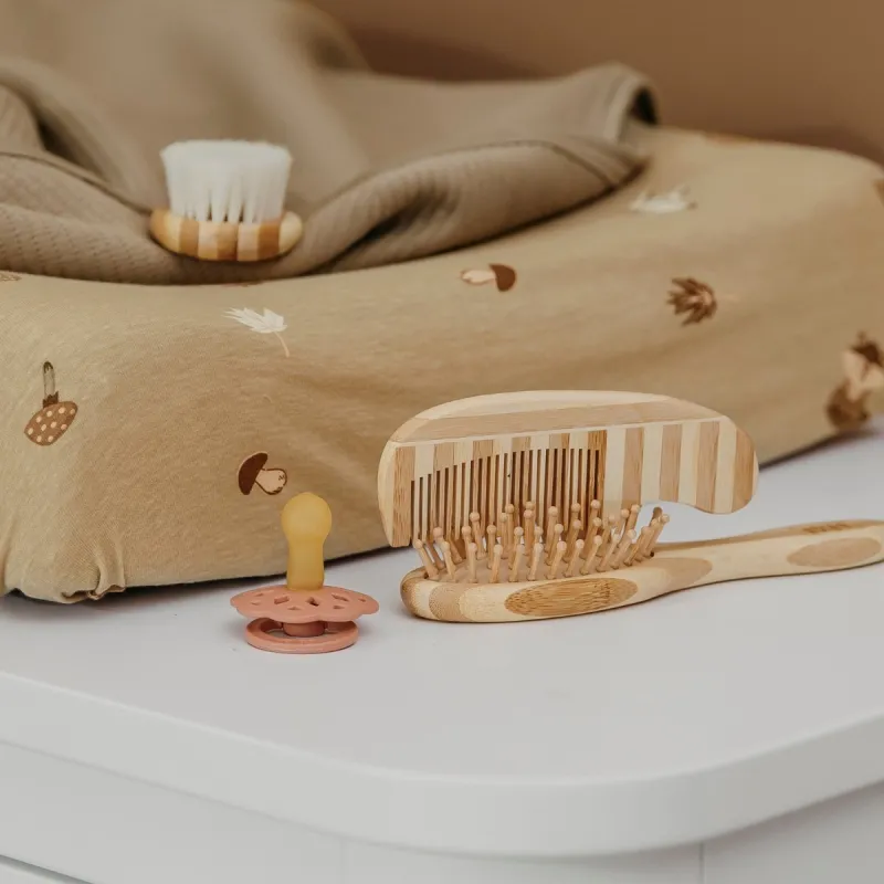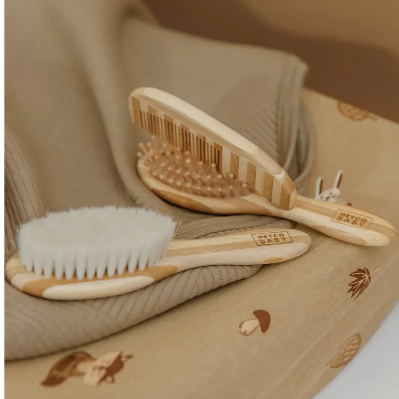 Um cabelo bem cuidado começa desde o primeiro dia! Com este elegante conjunto de cuidados de 3 peças da Meyco Baby, pentear se torna um momento suave e relaxante tanto para você quanto para o seu pequeno. O conjunto inclui um pente de madeira, uma escova com cerdas de cabelo de cabra para o delicado couro cabeludo do bebê e uma escova com pinos de madeira para cabelos mais grossos. Os conjuntos estão disponíveis em duas versões: um acabamento natural tipo bambu e uma combinação listrada em tons natural e nogueira. Além de práticos, são preciosos à vista, ideais para colocar na mesa de troca ou para presentear em um chá de bebê. Mais sobre o Meyco Baby Grooming Set As escovas estão especialmente projetadas para o delicado cabelo do bebê e seu couro cabeludo sensível. A escova de cabelo de cabra é extra suave e perfeita para o uso diário, enquanto a escova de pinos de madeira desembaraça suavemente o cabelo. O pente de madeira encaixa muito bem na mão e ajuda a desfazer pequenos nós. Graças aos seus materiais sustentáveis, é também uma opção respeitosa com o meio ambiente. Nota: O bambu é um material natural, portanto a cor de cada conjunto pode variar. O tom pode ser mais claro ou mais escuro, fazendo com que cada peça seja única. Vantagens Conjunto de 3 peças: escova de pinos, escova de cabelo de cabra e pente de madeira Disponível em design bambu natural ou em combinação natural/nogueira Suave e seguro para a pele delicada do bebê Design durável e estiloso Perfeito como presente de nascimento ou como básico na sua lista de essenciais Combina com toda a coleção de cuidados Meyco Baby