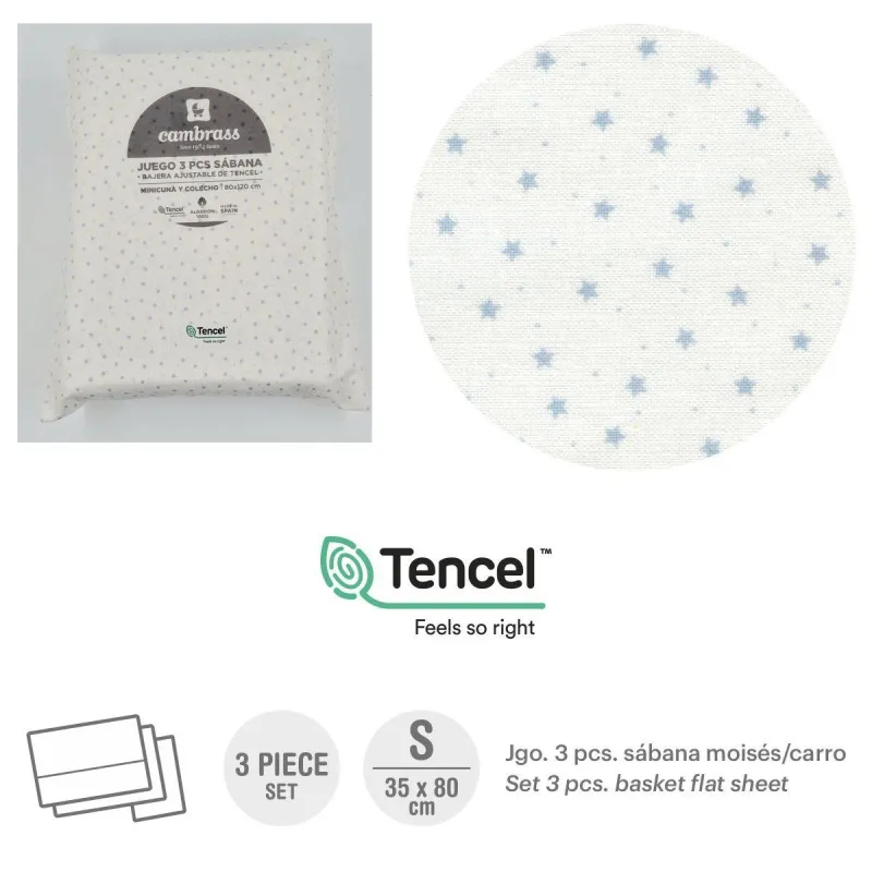 O lençol de berço de 3 peças da Cambrass é feito de 100% algodão e serve para berço e carrinho. Fabricado em Espanha. Por Cambrass.Design: MerloCor: Crú