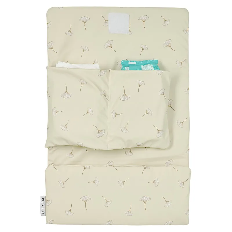 Às vezes, trocar seu pequeno quando você está fora de casa pode ser um verdadeiro desafio. Nem sempre você encontra trocadores disponíveis e, claro, você quer que seu bebê esteja confortável. Não se preocupe! As almofadas trocadoras de viagem da Meyco Baby são a solução perfeita. Onde quer que você esteja, poderá trocar seu bebê de forma segura e confortável. A almofada trocadora tem um bonito e sereno estampado de folhas de ginkgo. Então, você sai de casa com estilo, você e seu pequeno aventureiro! Esta almofada impermeável é perfeita para viajar. Graças aos seus práticos bolsos, você também terá sempre à mão tudo o que precisa, como fraldas e lenços umedecidos. Ideal, não é? O exterior da almofada é feito de 100% poliuretano, enquanto o interior e o enchimento são de 100% poliéster. Isso faz com que a almofada seja impermeável e muito fácil de limpar com um pano úmido. Já terminou de trocar? Basta passar um pano úmido, dobrá-la em um tamanho prático, fechá-la com o fecho de velcro e de volta para a bolsa! Assim de fácil pode ser.