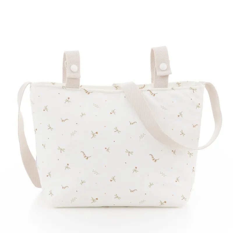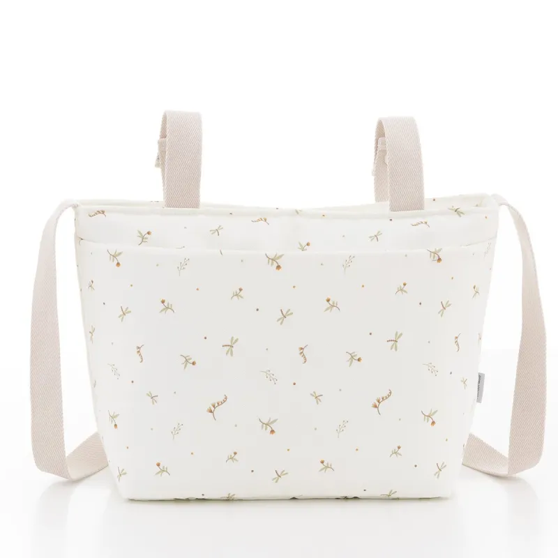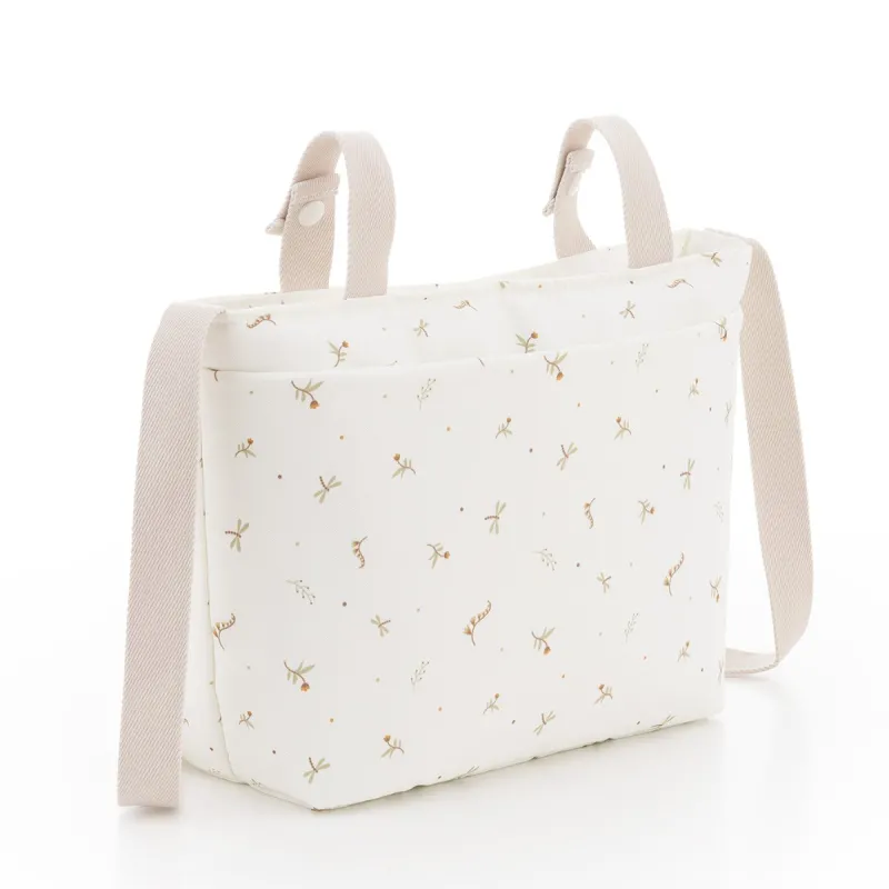 Uma bolsa organizadora com alças curtas para pendurar no carrinho, com design de bolsos internos e externos, oferece fácil acesso e organização para os acessórios do bebê durante os passeios. Prático e acessível.