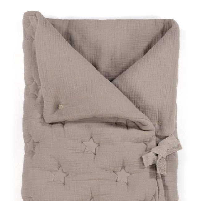 Arrullo/Manta Caetana - Sand com estrelas bordadas em bege, fabricado em musselina macia de 100% algodão. Perfeito para os primeiros dias do bebé, pode ser usado no berço ou como manta no berço. Fecho prático com velcros e fecho de correr para manter o bebé quente.