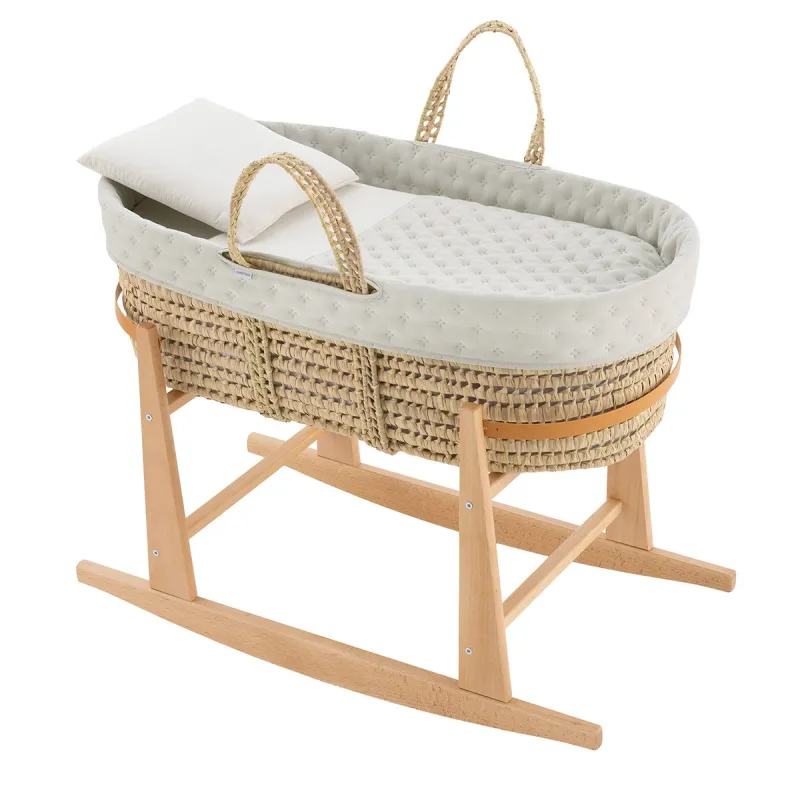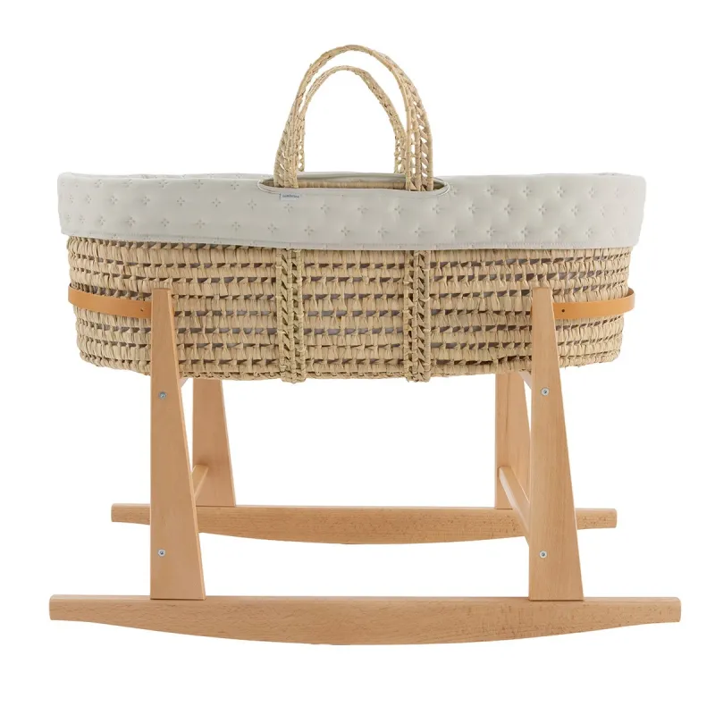O moisés de palma acolchado da Cambrass é uma opção excepcional para os primeiros meses de vida do seu bebê. Seu design cuidadosamente elaborado oferece tanto conforto quanto funcionalidade para satisfazer as necessidades do seu pequeno durante este período crucial de crescimento. Fabricado com uma base de vime, este moisés proporciona uma superfície sólida e estável para o descanso do seu bebê. Vem completo com um colchão, uma suave colcha, um confortável almofada e uma vestidura coordenável com a decoração do quarto, adicionando um toque de estilo e elegância ao ambiente. Para complementar este moisés e oferecer ainda mais versatilidade, o porta Cuco da Cambrass, também conhecido como portacapazo, é fabricado em madeira natural de alta qualidade. Sua altura ideal permite uma excelente visibilidade do bebê em todos os momentos, facilitando o contato visual com os adultos a partir da cama ou de outros lugares do quarto. Além disso, sua função de balanço proporciona um suave movimento que ajuda a facilitar o sono dos bebês, promovendo um ambiente tranquilo e relaxado.