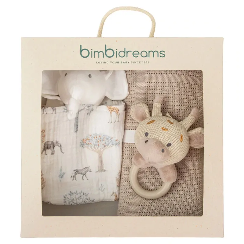Conjunto de presente muito completo: Inclui uma manta de algodão, um doudou de musselina com formato de elefante e um mordedor de girafa.