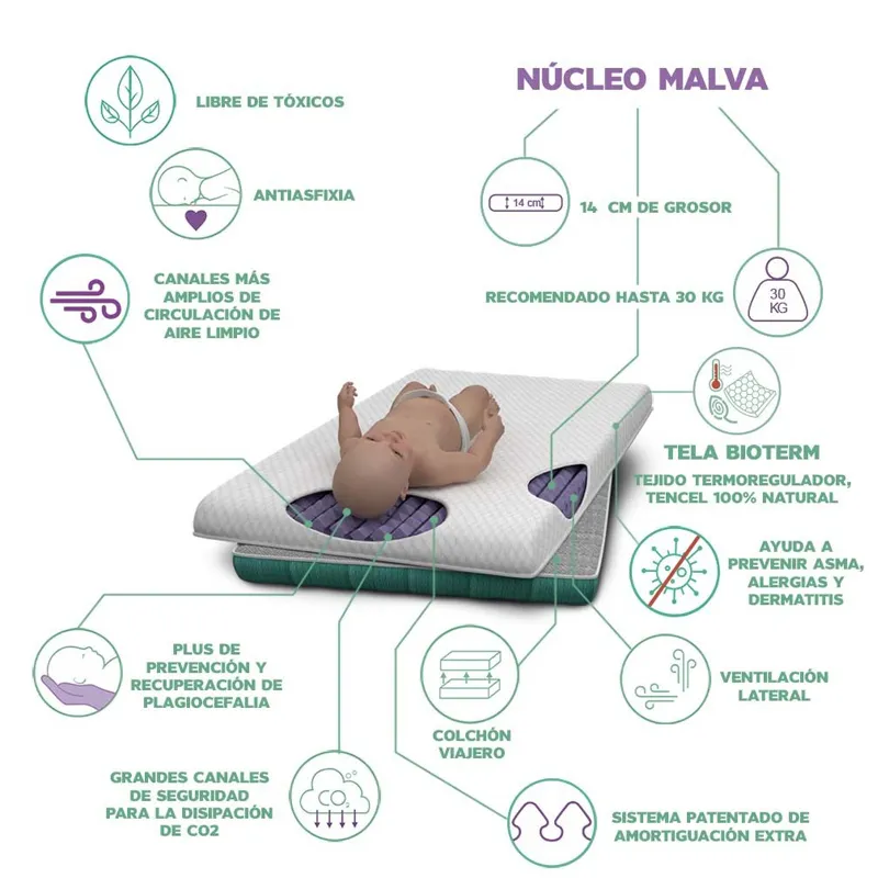 Previne a plagiocefalia: incorpora o núcleo Greencell® Pyramid mini, que distribui a pressão de forma equilibrada para evitar ou reduzir a síndrome da cabeça plana.