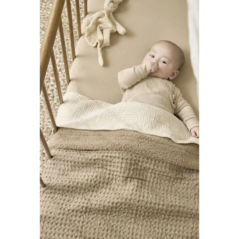 Maravilhosamente suave para a pele. Tecido 100% algodão com estrutura de waffle. Forro de pelúcia suave (100% poliéster). Disponível em diferentes cores. Em 2 tamanhos: como manta de berço e como manta de berço. Não use muito detergente (também é melhor para o meio ambiente). Lavável na máquina a 40 graus no máximo. Secar na máquina a baixa temperatura.