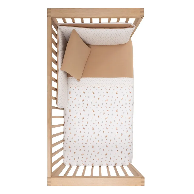 Conjunto de 2 peças para vestir o berço, composto por capa nórdica e protetor (enchimento incluído) + almofada decorativo. Feito na Espanha. Fabricado por Cambrass.