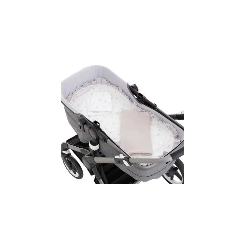 Pack para capazo composto por uma colcha de capazo, um secababas e uma muselina Meyco, pensado para oferecer conforto, proteção e praticidade tanto em casa como durante o passeio.