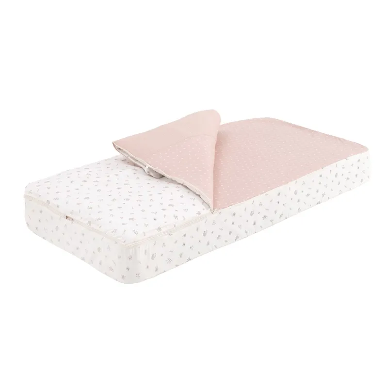 O Saco cuna inverno e verão serve para berços de 60x120 cm. Como vestidura para o berço, protege o bebê do frio como faria um edredom, uma manta ou um cobertor e geralmente é utilizado em berços de camping ou de viagem. Além disso, aporta um alto componente estético, já que a capa está disponível em todos os tecidos da coleção de Cambrass e pode ser coordenada com o restante da decoração do quarto do bebê. Também incorpora o enchimento removível, o que facilita sua lavagem e permite o uso do saco tanto no inverno quanto no verão. Além disso, o saco conta com duas características que o tornam especialmente prático: o simples sistema de fechamento por meio de zíper duplo e a zona elástica do contorno inferior que serve para ajustá-lo ao colchão. É um artigo muito utilizado em creches e em segundas residências, já que com um único artigo se veste todo o berço. Fabricado na Espanha. Por Cambrass