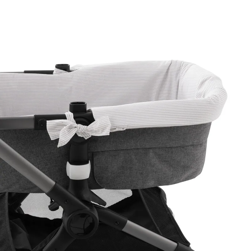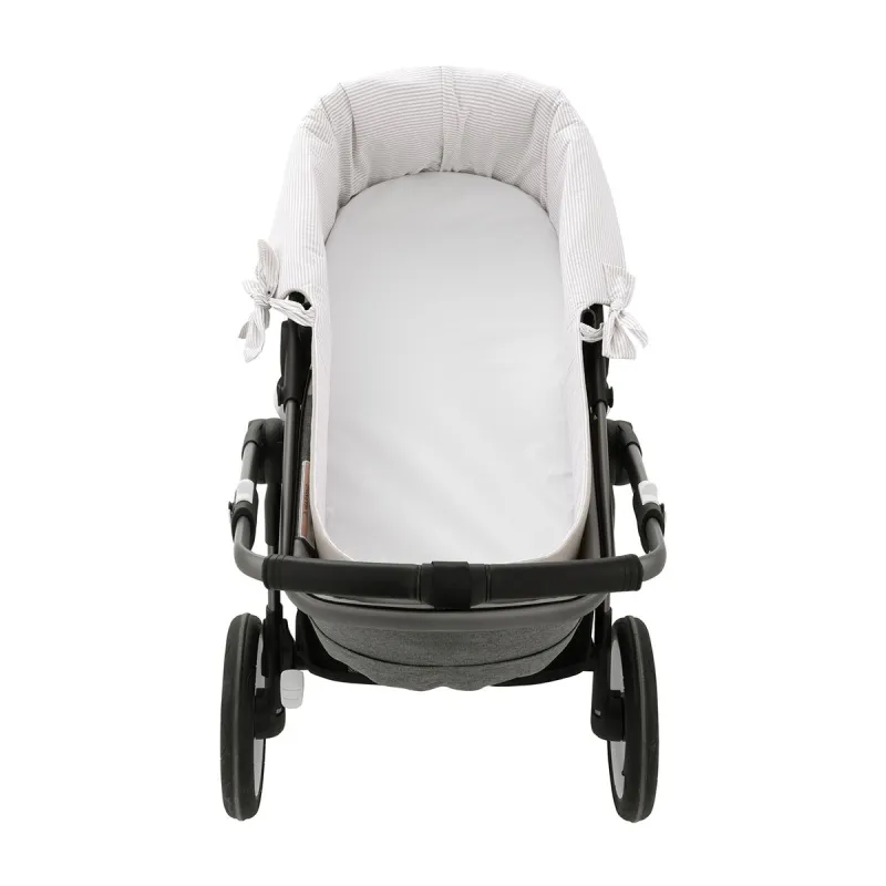 Garnitura reversível para capazo com capota e sistema de zíper, projetada para vestir e proteger o interior do capazo com um ajuste preciso e funcional.
