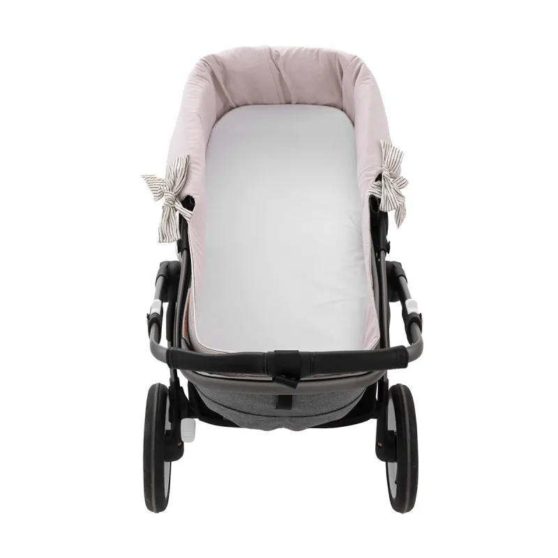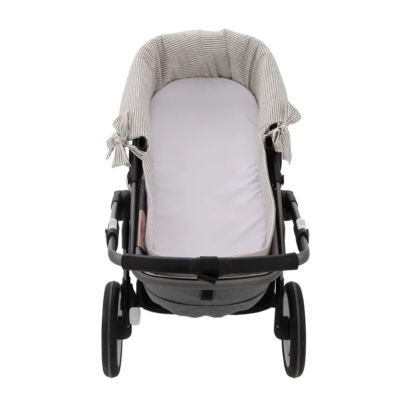 Garnitura reversível para capazo com capota e sistema de zíper, projetada para vestir e proteger o interior do capazo com um ajuste preciso e funcional.