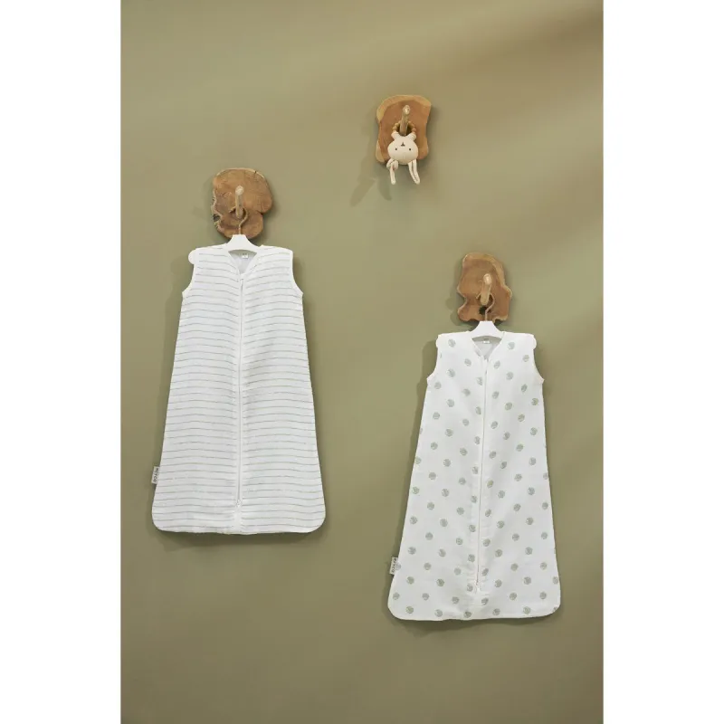 El saco de dormir está disponible en las siguientes tallas: 70 cm para usar de 3 a 9 meses aproximadamente y una longitud de 60 a 75 cm. 90 cm para usar de 6 a 30 meses y una longitud de 70 a 95 cm. 110 cm a partir de los 24 meses y una longitud de 90 a 115 cm. La estatura de tu hijo es más importante que la edad para determinar el tamaño adecuado del saco de dormir. Si el saco de dormir es demasiado grande, tu bebé puede hundirse. Nunca utilices un saco de dormir si la cabeza de tu pequeño cabe por la abertura del cuello. En un saco de dormir demasiado pequeño, tu hijo no podrá estirar completamente las piernas ni tendrá espacio suficiente para moverse, la distancia entre sus pies y la parte inferior del saco de dormir no debe ser inferior a 10 cm. Por tanto, asegúrate siempre de que el saco de dormir es de la talla adecuada. Fabricado en algodón 100% hidrófilo. Óptimo confort para dormir en los días y noches más calurosos del verano. Buena ventilación y absorción de la humedad. Secado muy rápido. Confort maravillosamente suave para la delicada piel del bebé gracias al tejido hidrófilo. Disponible en varias tallas y colores. Ajuste seguro. Lavar antes de usar para fortalecer el tejido. No utilice demasiado detergente (también es mejor para el medio ambiente). Utiliza un ciclo delicado cuando laves este frágil tejido hidrófilo y, si es necesario, utiliza una bolsa de lavandería para evitar recoger el tejido. Lavable a máquina a 40 grados como máximo. Apto para secadora. Se puede planchar a temperatura media-alta.