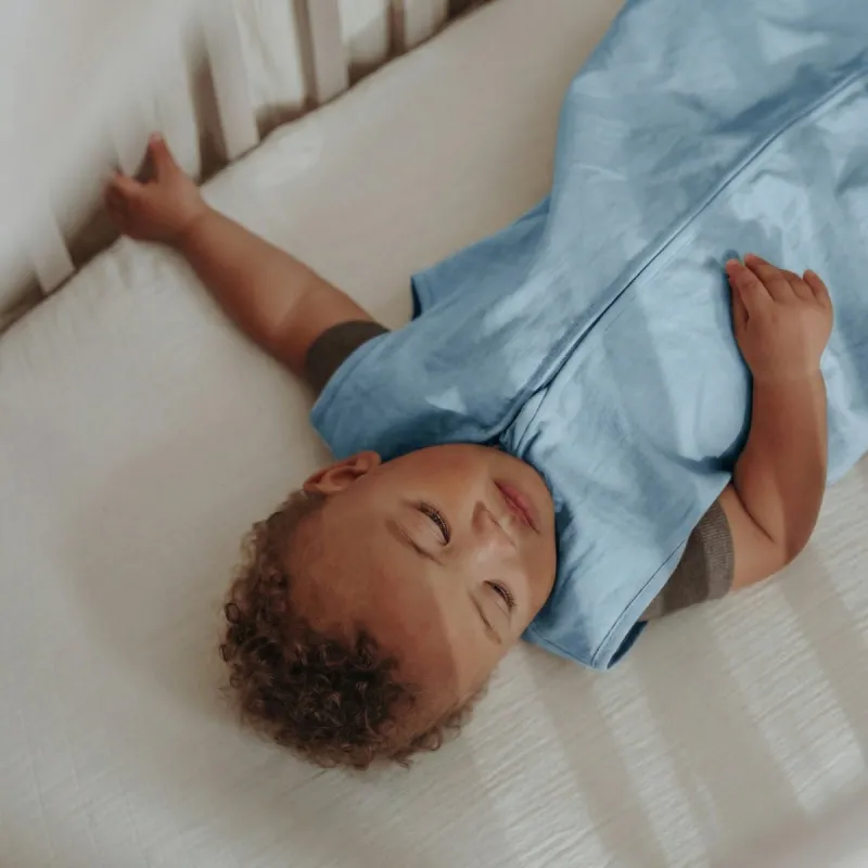 El saco de dormir no está forrado y está confeccionado con un tejido fino de una sola capa compuesto por 52% lino y 48% algodón. El lino es conocido por sus excelentes propiedades refrescantes y resulta ideal para las cálidas noches de verano, mientras que el algodón aporta suavidad y comodidad al contacto con la piel. El material transpirable garantiza una excelente ventilación y un entorno de descanso fresco, ayudando a que tu pequeño se mantenga cómodo sin sobrecalentarse. Gracias a su ajuste seguro alrededor del cuello y las sisas, tu hijo puede moverse libremente mientras duerme de forma segura.