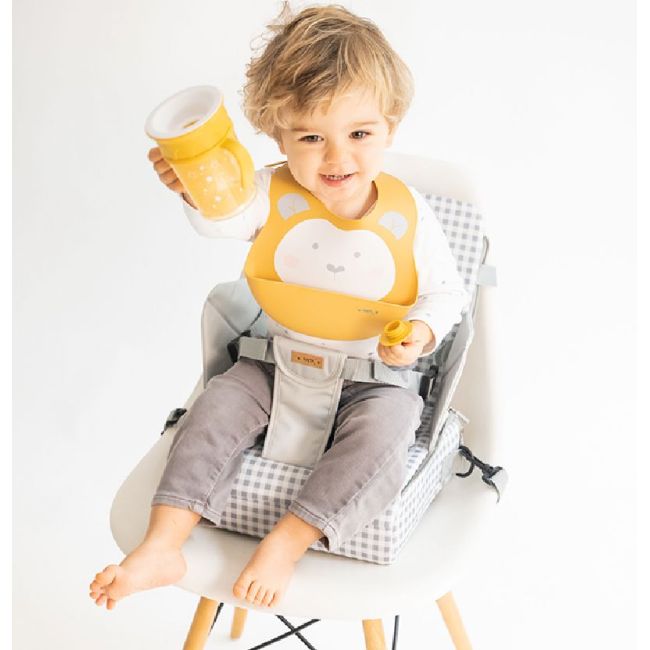 Gracias a esta trona portátil, podréis comer en familia tanto en casa como fuera de ella. ¡2 en 1! Diseño multifuncional que se puede utilizar también como bolso, con amplio espacio para tener en orden y a mano todos los utensilios del bebé. Diseñada para adaptarse a la mayoría de sillas de tamaño estándar. Muy estable, cómoda y segura.