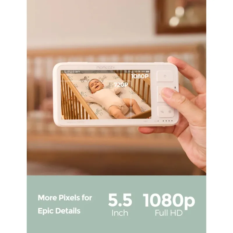 Monitor de bebé con pantalla Full HD de 5.5”, visión nocturna automática y audio bidireccional. Alertas de sonido y movimiento con conexión estable para una vigilancia continua.